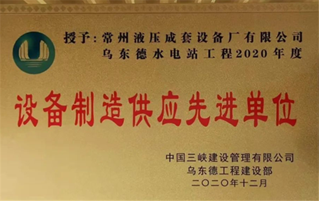 近日,中國三峽建設(shè)管理有限公司烏東德工程建設(shè)部召開2020年度設(shè)備制造供應(yīng)先進(jìn)單位表彰大會。常州液壓成套設(shè)備廠有限公司以優(yōu)質(zhì)的產(chǎn)品和優(yōu)異的服務(wù)在眾多供應(yīng)商中脫穎而出,繼2019年獲得“設(shè)備制造供應(yīng)先進(jìn)單位”稱號之后,再次蟬聯(lián)此殊榮。常州液壓作為中國三峽建設(shè)管理有限公司烏東德水電站項目液壓啟閉機(jī)成套設(shè)備供應(yīng)商