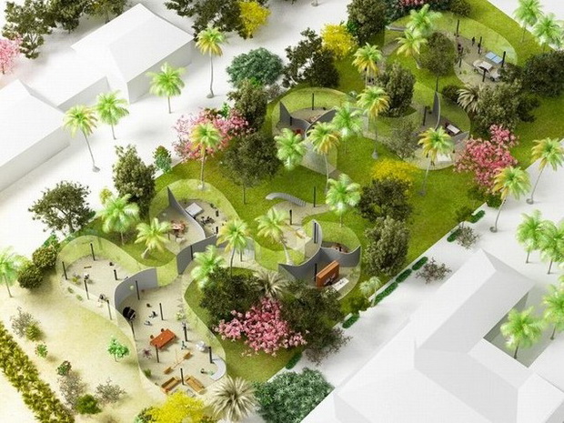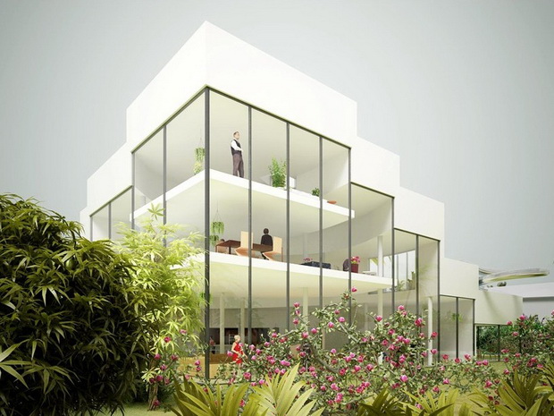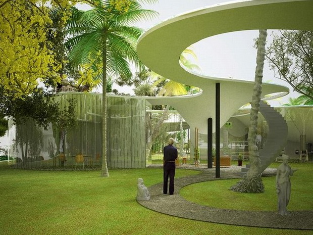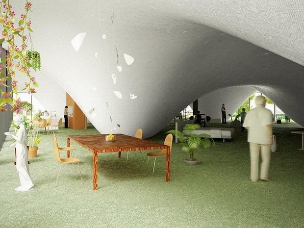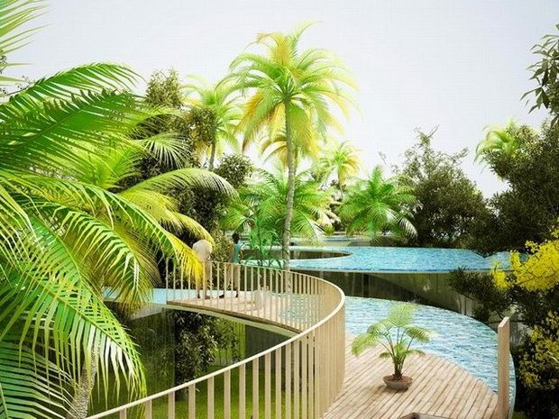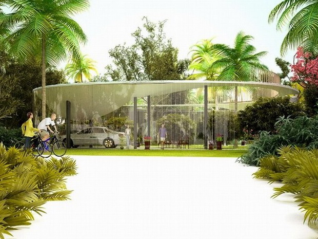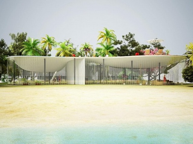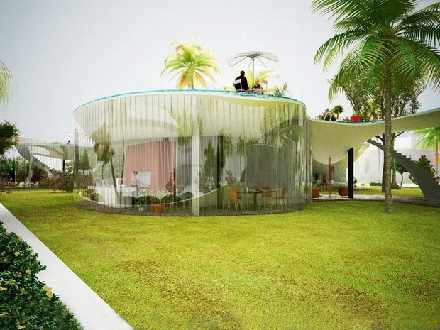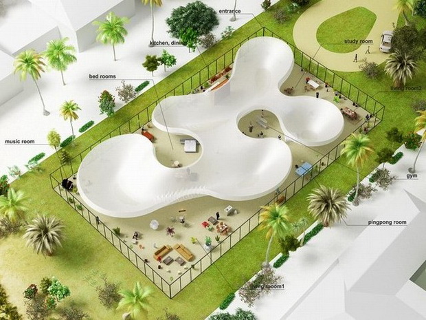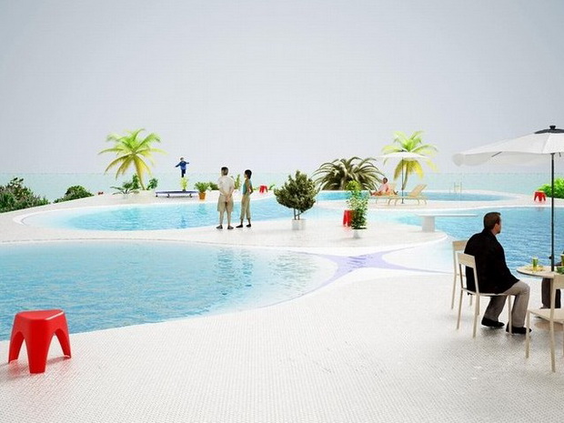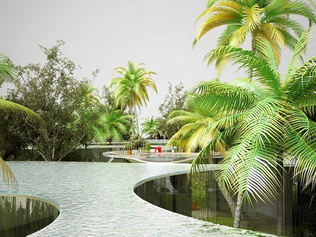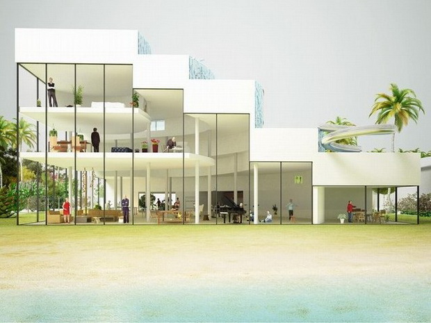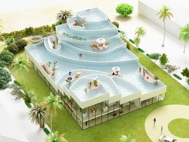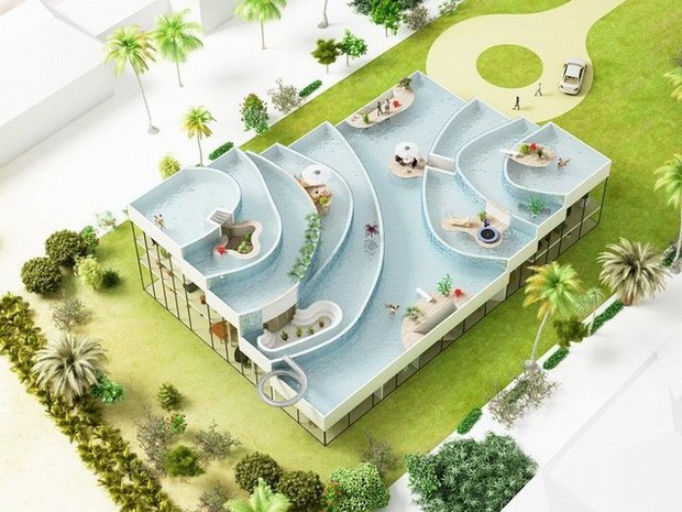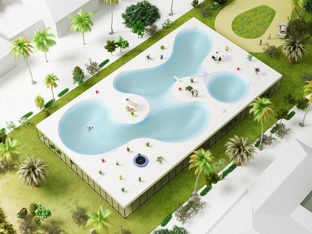 來自荷蘭的NLarchitects建筑事務(wù)所總能為我們帶來不一樣的新奇想法,很快他們設(shè)想了三個(gè)方案。都是將泳池架設(shè)在住宅的屋頂,房子的生活區(qū)位于泳池下面,以通透的玻璃幕墻圍合。通過泳池的不同形狀與深度劃分出下面的空間,上面的泳池儼然成為一個(gè)水上樂園!