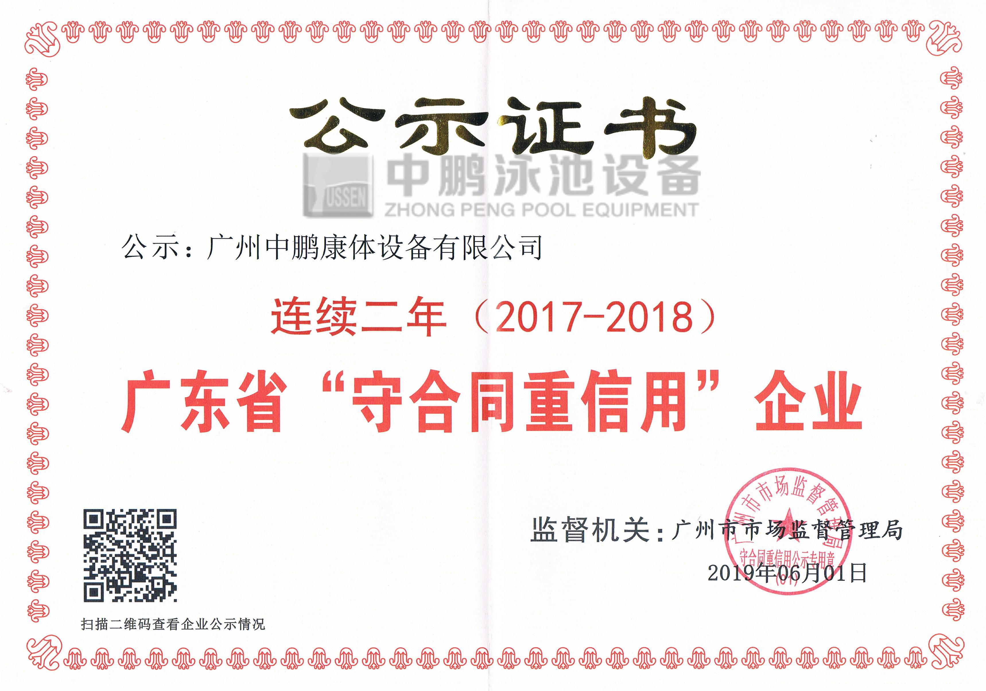 廣州中鵬康體設備有限公司連續(xù)2年榮獲廣州市工商行政管理局頒發(fā)的“廣東省守合同重信用企業(yè)”榮譽證書和牌匾, 上述連獲榮譽稱號的取得,意味著公司在行業(yè)信用方面取得了政府權威機構的認可,是對公司信用度的肯定,是公司實力的表現(xiàn)。以上榮譽的取得也有助于拓展公司業(yè)務,提高公司業(yè)務承攬能力,為公司業(yè)績的增長提供支持。同時,擴大了公司休閑康體領域的影響,對公司提高綜合競爭并實現(xiàn)長遠發(fā)展目標具有重要戰(zhàn)略意義。